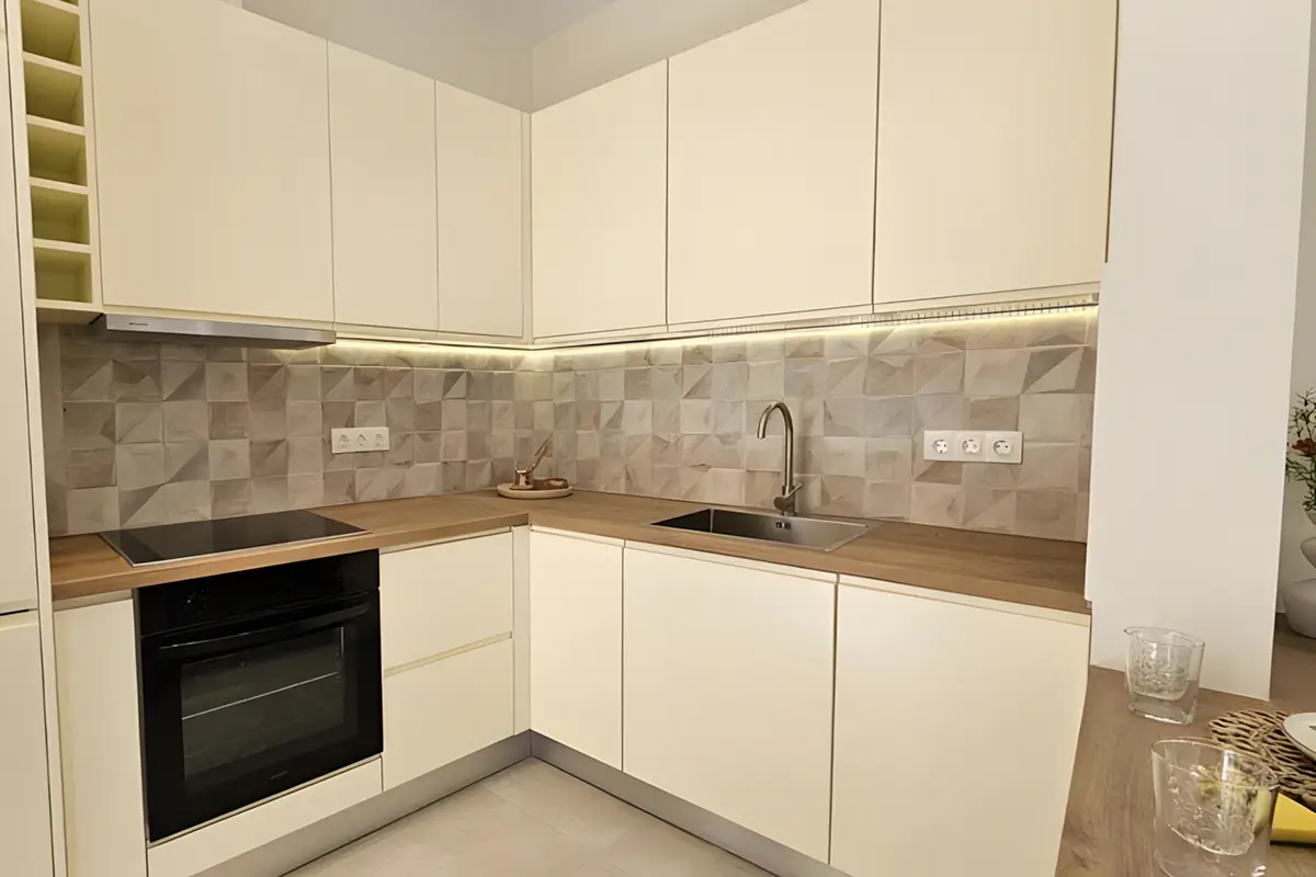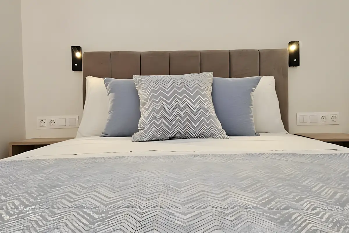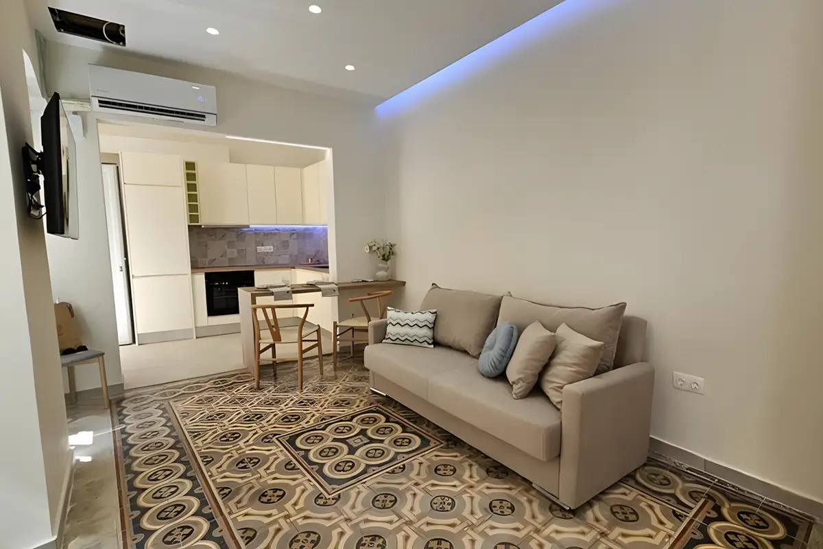 Designed for relaxed living, the 43 m² apartment features a serene double bedroom, a bright living area with a comfortable sofa bed, and a modern bathroom with a walk-in shower. The fully equipped kitchen includes everything you need for meals at home, while air conditioning, high-speed Wi-Fi, a washing machine, and a flat-screen TV ensure a seamless stay, whether you’re visiting for a few days or settling in longer. Warm tones, quality furnishings, and a calm, welcoming atmosphere create a space where you can unwind after full days of exploring.